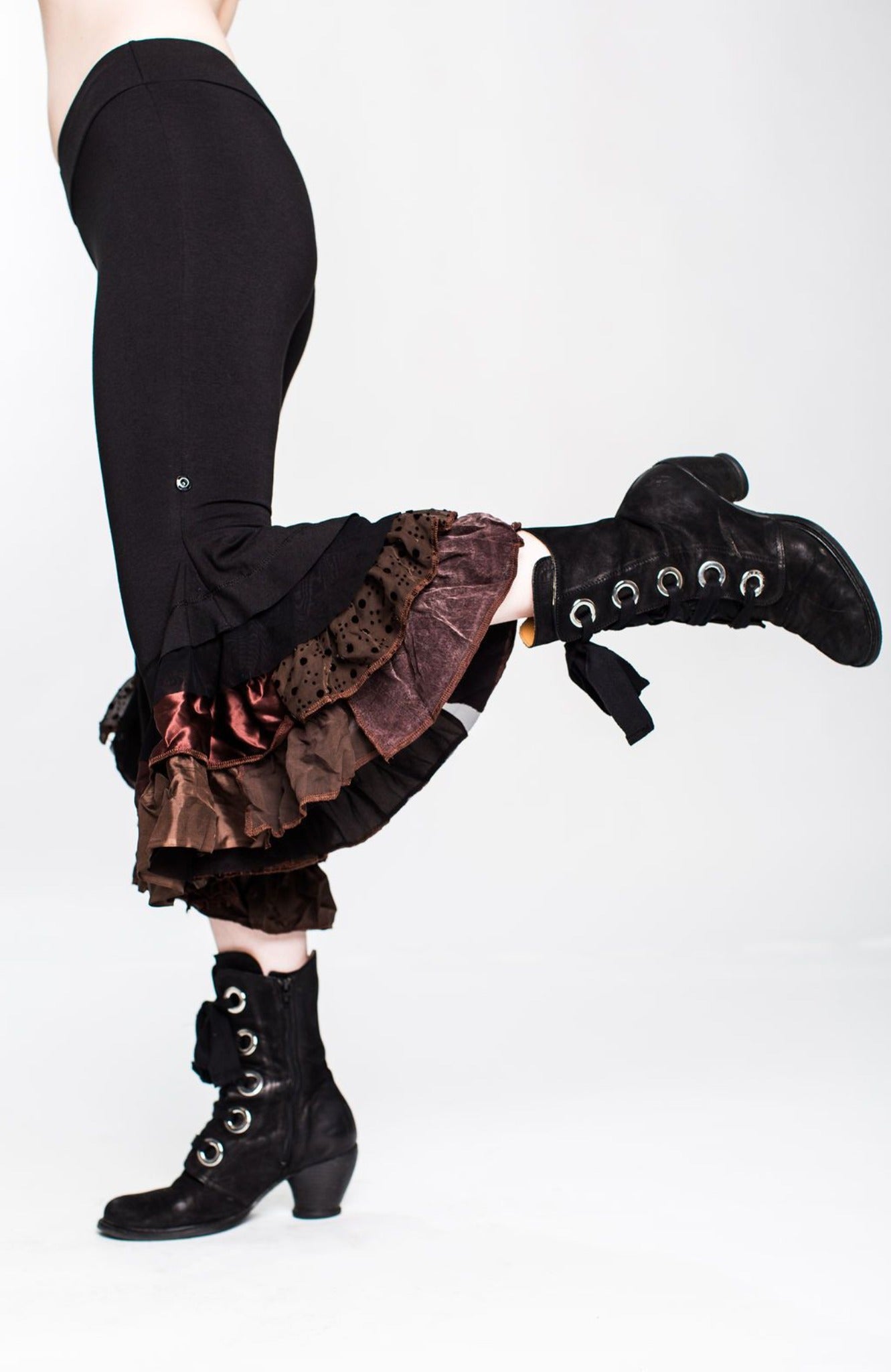 • Hand-cut, upcycled remnant ruffles. Ruffle placement is unique to each pant.